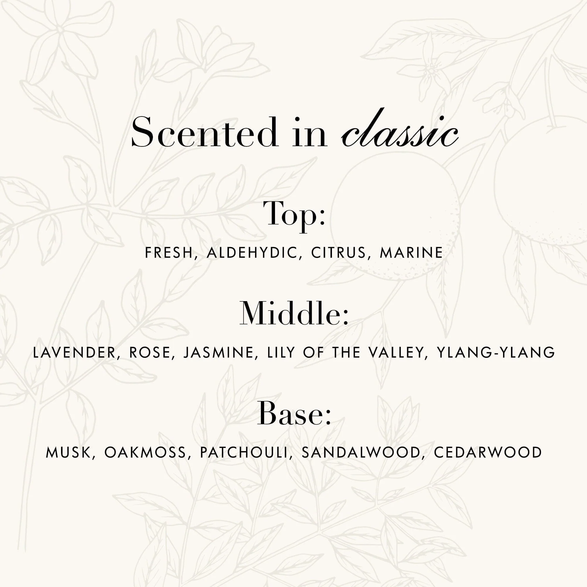 - Clean and airy Classic fragrance with notes of lily of the valley, sweet musk and sandalwood